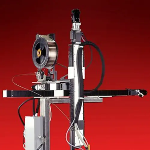 The Model 2 “building block” approach uses a series of standardized motion stages for functions such as AVC (Arc Voltage Control), Torch Oscillation (weaving), onboard Wire Feeder and in some cases, Travel. Up to eight axes of movement can be integrated into a welding system and controlled by the AMI Model 415 WDR Power Supply, including positioners, side beams, welding lathes and seamers. The Model 2 can also be equipped with a wide variety of general and specialized welding torches including hot wire and remote arc viewing systems.